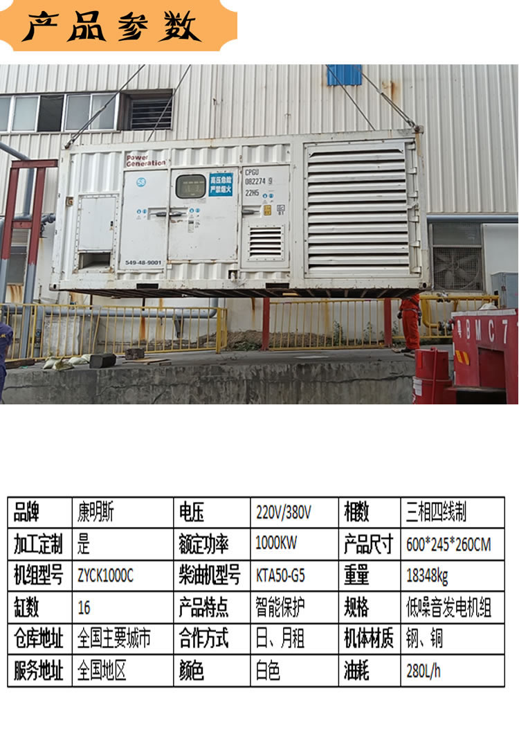 公司為客戶供應有多種型號的康明斯發(fā)電機組,可以根據(jù)客戶自身用電需求使用相應功率的發(fā)電機組供電。公司提供的功率小到50KW,大到1600KW的功率均有供應。在這我公司就簡單的用1000KW的康明斯發(fā)電機組為例,簡單介紹一下相關參數(shù)。